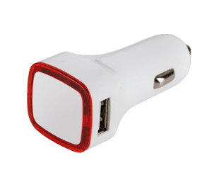 Cargador para automóvil con 2 entradas USB. Fino detalle de color traslúcido en contorno. Voltaje 5.1V, 1A y 2.1A. Presentación: caja en color blanco. Medidas: 7 x 3.1 x 2.7 cm