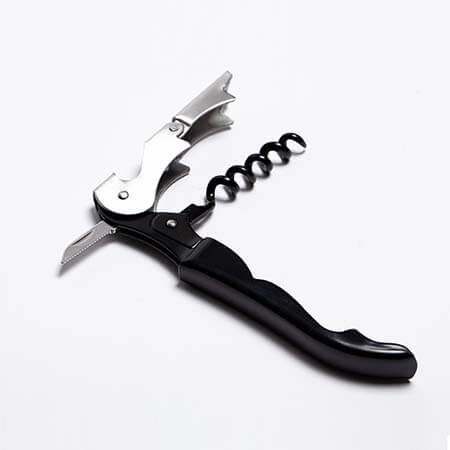 Abrebotellas metálico que incluye sacacorchos, destapador y navaja.