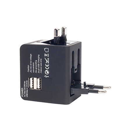 6 x 4,6 cm. Plástico engomado. Adaptador universal para contactos eléctricos. Dos entradas USB para utilizarlo como cargador, boton push que al presionar saca tres adaptadores UK, USA/ASUT y europeo. Luces indicadoras de encendido. Con caja plástica. Presentación en caja de regalo.