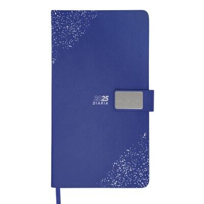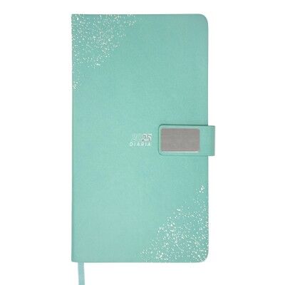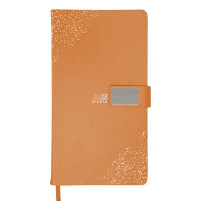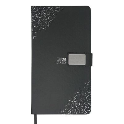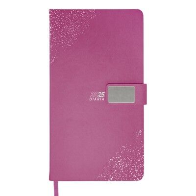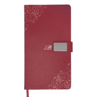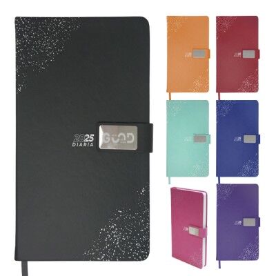 Agenda diaria de pasta rígida con cintillo de PU con placa metálica en color plata, logotipo y decorado de la pasta también en plata. Interior tipo cuaderno de 170 hojas (340 páginas), Incluye: cuadro de dedicatoria, hoja de datos personales, calendario 2025 y días festivos, calendarios 2024 a 2028, teléfonos de interés, planificador anual, planificadores mensuales (12), agenda diaria 365 días y directorio de contactos. Cuenta con resorte sujetador para bolígrafo y listón separador del color de la agenda, impreso con el año. Medidas: 15 x 21.5 cm