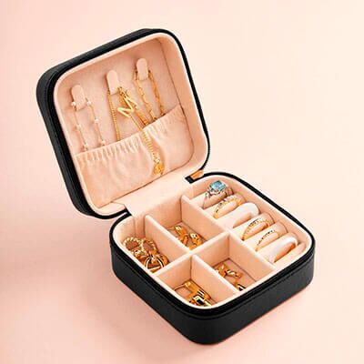 Alhajero con compartimento principal con cierre. Interior tipo terciopelo que protege la joyería de rayones y daños. Incluye 3 ganchos para collares, 6 ranuras para anillos, 1 bolsillo interior con elástico y 4 divisiones. Medidas: 9.3 x 9.3 cm