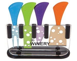 Set de 4 piezas de acero inoxidable para cortar queso o carnes frías, con mango de polipropileno y base de acrílico. Incluye caja por jgo.