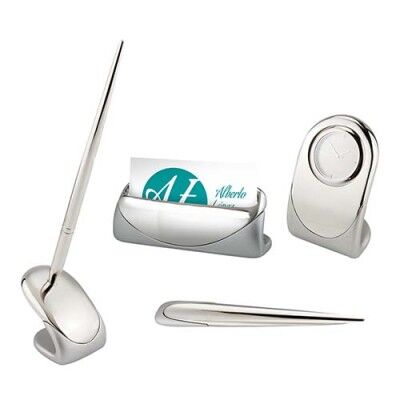 Incluye tarjetero, base con bolígrafo, abrecartas, reloj y caja de regalo. Medidas: 10.2 x 3.4 cm Tarjetero / 3.8 x 4.1 cm Base para Bolígrafo / 2.1 x 15.5 cm Abrecartas / 5 x 8 cm Reloj