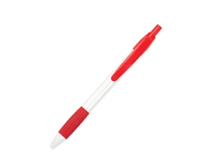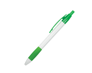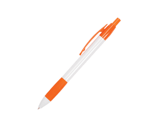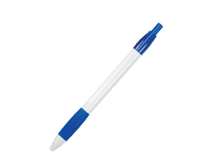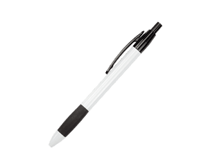Bolígrafo de cuerpo blanco con goma antideslizante de color y clip. Mecanismo de click.