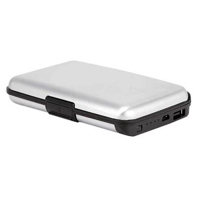 Cuenta con 5 espacios para tarjetas y batería auxiliar capacidad 2,500 mAh. Incluye cable adaptador compatible con micro USB. Sistema anti robo RFID. Medidas: 10.5 x 7 cm