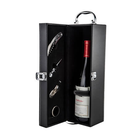 Set para vinos de curpiel con 4 accesorios: Incluye saca corchos, boquilla, corta gotas y corcho metálico. Medidas: 12.5 alto x 36 ancho