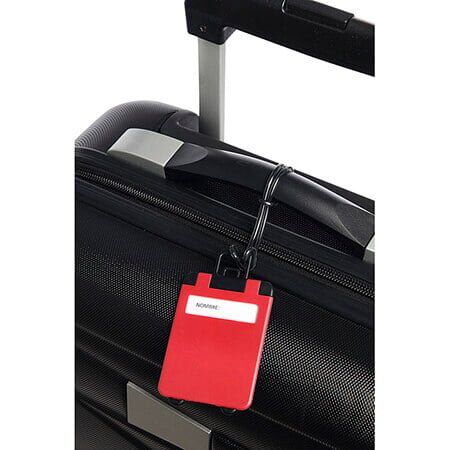 5,4 x 9 cm. Plástico. Identificador en forma de valija / maleta. Cuenta con etiqueta para datos personales. Lazo de plástico para colgar en la manija del equipaje. .