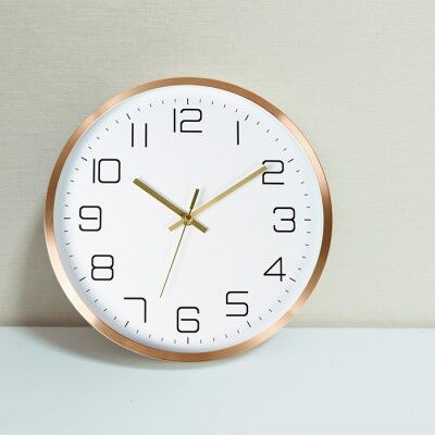 Reloj de pared 30 cm. de diámetro, arillo de aluminio color dorado y protección de cristal, incluye caja de cartón individual y Baterias. Medidas: 30x30 cm.