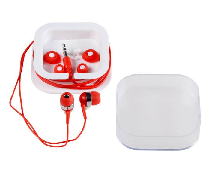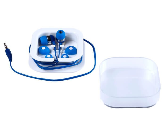 Audífonos personales con estuche cuadrado y esquinas redondeadas. Con 2 pares de repuestos de protectores de goma, soporte para enrollar cable, tapa plástica transparente. Extensión total: 116 cm.