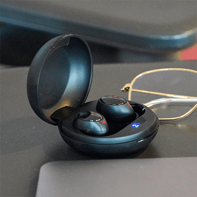 Audífonos bluetooth con estuche de plástico circular para carga y mecanismo touch. Incluye una pantalla de visualización de porcentaje de carga y cable. Medidas: 3 alto x 6.5 ancho