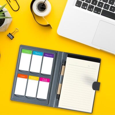 Block de notas cubierta en curpiel con 70 hojas de raya, notas adheribles (días de la semana), bolígrafo tinta negra y broche de seguridad. Medidas: 20x14.5 cm.