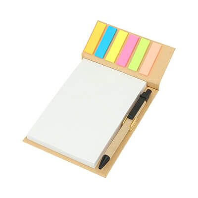 Block de notas ecológico con 100 hojas blancas, notas adhesivas y bolígrafo. Medidas: 11.5 alto x 15 ancho