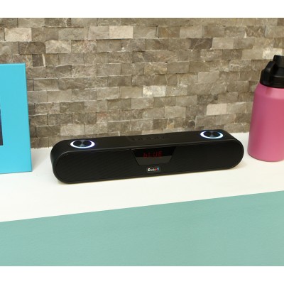 Bocina inalámbrica con radio FM, entrada para tarjeta TF, USB y auxiliar. Incluye cable de carga tipo-C. En la parte superior cuenta con 4 botones para funciones y 2 luces led. En la parte frontal tiene una pequeña pantalla. Incluye caja de cartón individual. Medidas: 5.5x37 cm.
