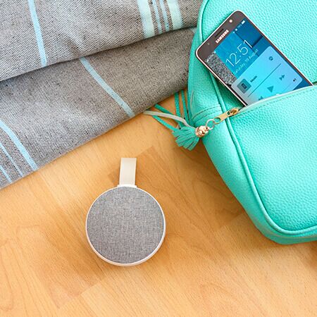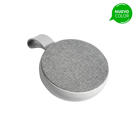 Bocina inalámbrica con radio FM, Resistente al agua con acabado tipo rubber, detalles en tela de poliéster y asa superior. Carga a través de cable USB (incluido). Incluye caja de cartón individual. Medidas: 9x9 cm.