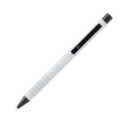 Bolígrafo con barril de aluminio acabado brillante, botón de plástico y clip metálico. Tinta de escritura azul. Medidas: 14.9x1 cm.