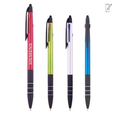 Bolígrafo plástico con terminado metalizado. Tiene integradas 3 tintas: negra, roja y azul. Parte inferior con goma antideslizante en negro con detalles de arillos en gris. Cuenta con touch para dispositivos táctiles. Mecanismo deslizante para cambio de tinta. Medidas: 14.6 x 1.1 cm