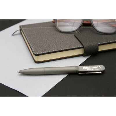 Bolígrafo con efecto de luz led, fabricado en aluminio y plástico, con clip metálico. La luz se muestra al grabar logo con láser (puede usarse en ambos lados). Cuenta con mecanismo de giro y tinta de escritura negra.