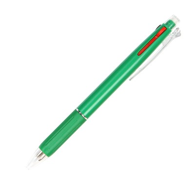 Bolígrafo triple fabricado en plástico ABS, tres tintas: negra, roja y azul, con clip de plástico transparente, con acción de empuje, parte superior y punta transparentes, empuñadura de goma de color. Medidas: 14.4x1.2 cm.