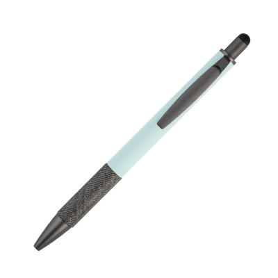 Bolígrafo con barril de aluminio suave y detalle apariencia piel en la parte inferior, clip y punta metálicos, con touch en la parte superior. Tinta de gel escritura azul. Medidas: 14.5x1 cm.