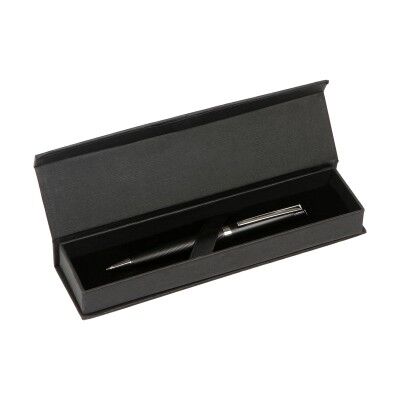 Bolígrafo metálico con detalles cromados en punta y clip, tinta de escritura negra. Incluye estuche individual. Medidas: 13x1.2 cm.