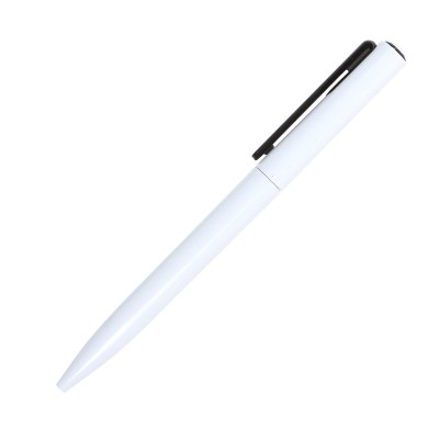 Bolígrafo de acción giratoria, cuerpo blanco sólido, clip de color sólido, recarga delgada X-20. Barril fabricado en ABS. Tinta de escritura negra. Medidas: 14.6x1.1 cm.