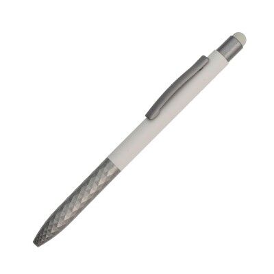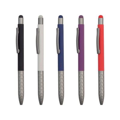 Bolígrafo con barril de aluminio, clip y punta metálicos, con detalles en la punta del bolígrafo que le da un toque de estilo, con touch en la parte superior. Tinta de escritura de gel azul. Medidas: 14.5x1 cm.