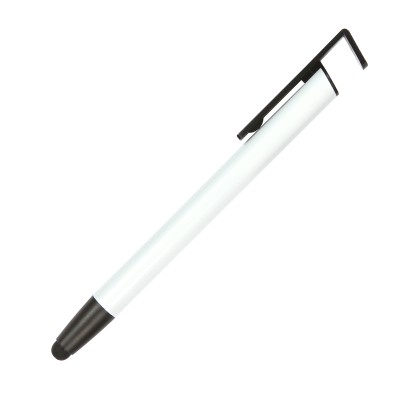 Bolígrafo con barril fabricado en aluminio, detalles en plástico. Mecanismo de botón. La parte superior sirve como porta celular. Tinta de escritura azul. Medidas: 14.3x1 cm.