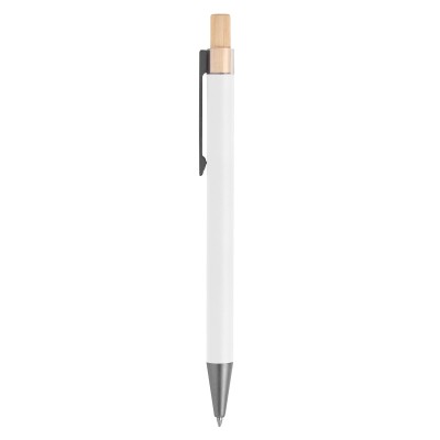 Aluminio y bambú. Bolígrafo retráctil. Cuerpo metálico en diferentes colores acabado mate. Clip metálico y puntera plástica color gris acabado mate. Pulsador de bambú. Tinta negra.