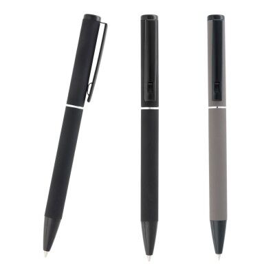 Bolígrafo metálico con acabado rubber, clip y mecanismo retractil. Medidas: 1 alto x 13.3 ancho