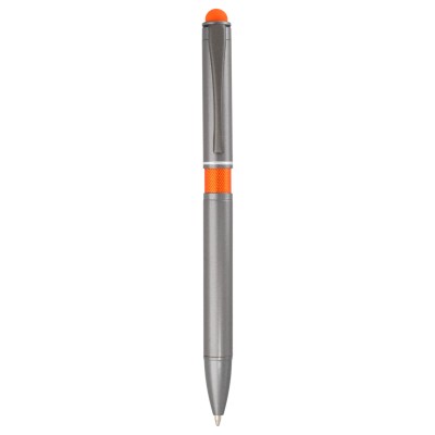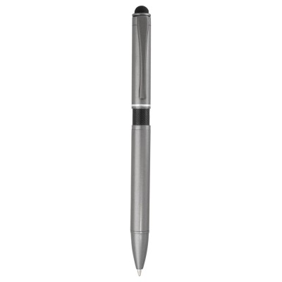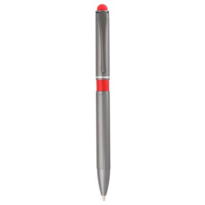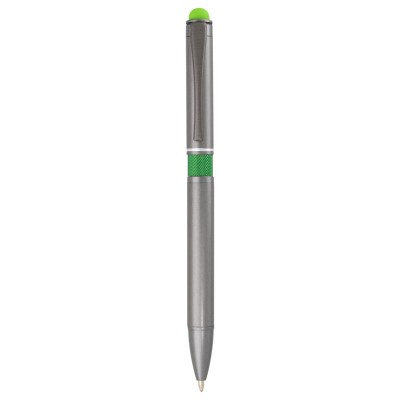 Bolígrafo metálico con detalle en el centro, clip, goma touch screen y mecanismo de click. Medidas: 1 alto x 14.5 ancho