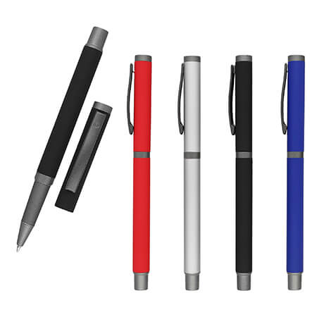 Bolígrafo metálico acabado rubber con detalles en base y tapa color gris. Medidas: 13.3 alto x 1 ancho