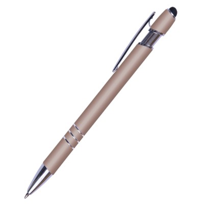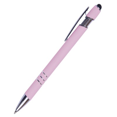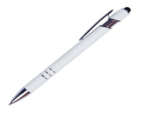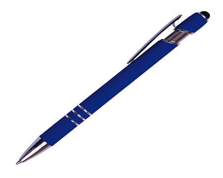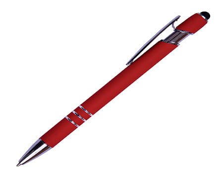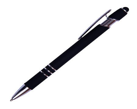 Bolígrafo de aluminio con recubrimiento de goma. Con detalles y clip metálico. Punta touch y mecanismo de click. Medidas: 14.2 x 1 cm
