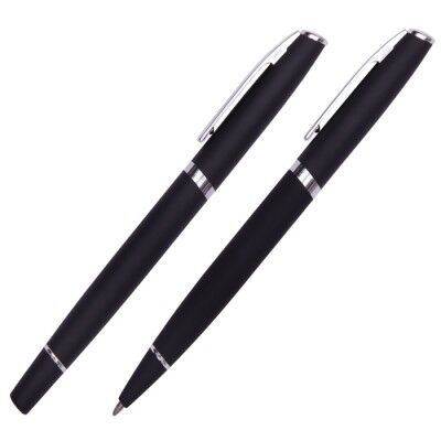 Set de Bolígrafos metalicos con recubrimiento de goma. Incluye bolígrafo tipo roller con tapa y bolígrafo con mecanismo retráctil. Detalles y clip metálicos. Presentación: caja en color negro. Medidas: Bolígrafos: 14 x 1.1 cm // Estuche: 17.5 x 5.5 x 2.5 cm