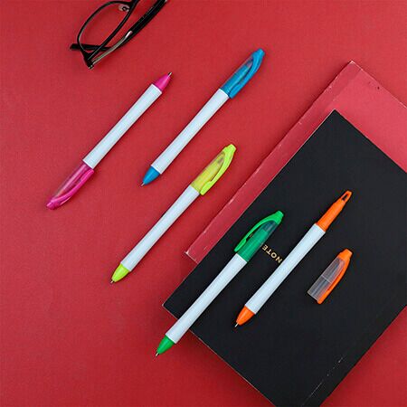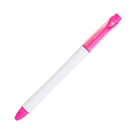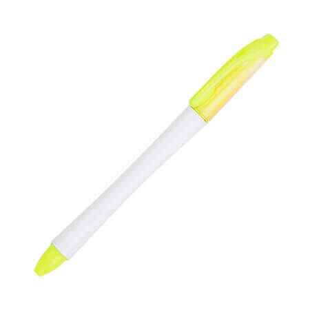 Bolígrafo 2 en 1 con marca textos; barril plástico color blanco, tapa en la parte superior translucida con detalles de color en clip y punta. Tinta de escritura negra. Medidas: 14.1x1.2 cm.