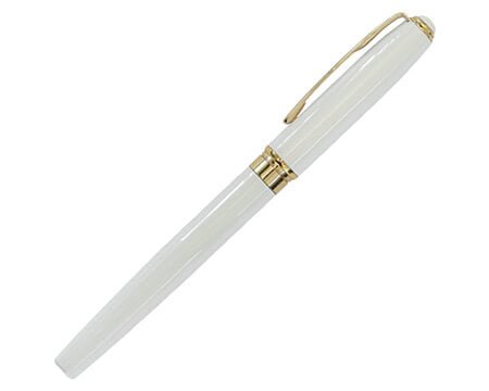 Bolígrafo metálico tipo roller de tinta alemana, con clip y detalles bañados en oro de 18 kilates. Cuenta con tapa que cierra a presión y repuesto especial con rosca para sujetarse firmemente. Presentación: caja en color negro. Medidas: Bolígrafo: 14 x 1.2 cm // Estuche: 17.3 x 3 x 5 cm