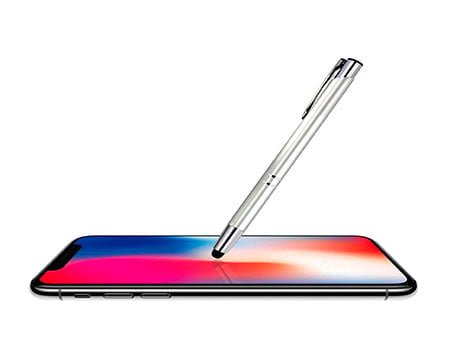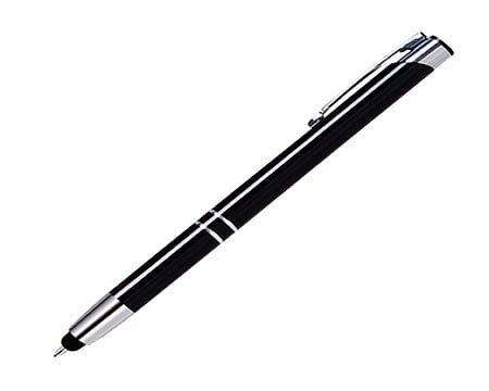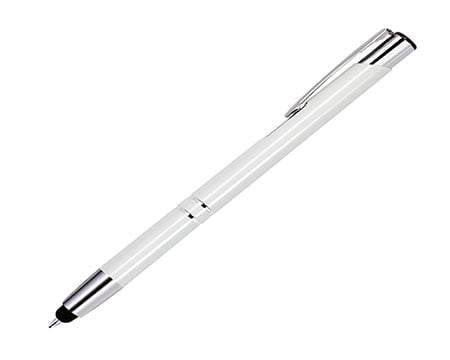 Bolígrafo delgado de aluminio, con punta cromada y punta touch para pantallas táctiles. Mecanismo de click. Medidas: 13.6 x 1 cm