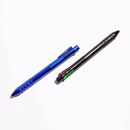 Bolígrafo de metal con mecanismo retráctil y cuatro colores de tinta (negro, azul, rojo y verde). Incluye estuche. Incluye un Grabado Láser GRATIS.