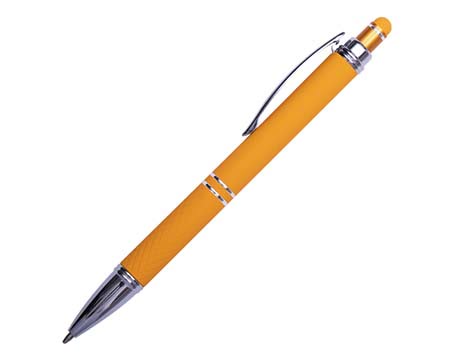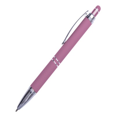 Bolígrafo de Aluminio con recubrimiento de goma, parte inferior con textura. Detalles y clip metálico. Punta touch y mecanismo de click. Medidas: 14 x 1.1 cm