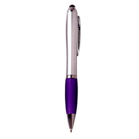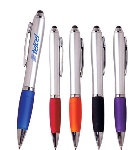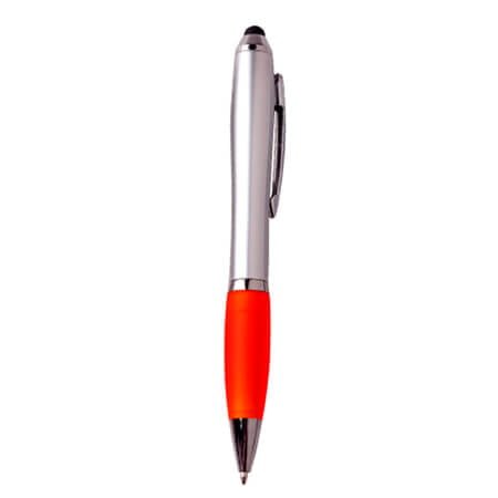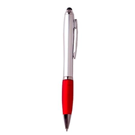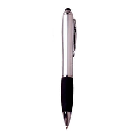 Bolígrafo de plástico con mecanismo retráctil, clip metálico, grip de goma y goma touch screen. Medidas: 13.5 alto x 1.2 ancho