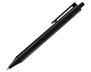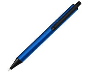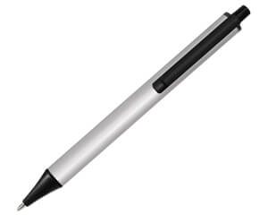 Bolígrafo metálico con cuerpo de color, punta y clip de plástico en negro, diseño peculiar que le da realce.