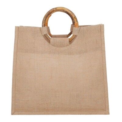 Bolsa de yute con doble asas de madera y fuelle. Medidas: 34.5 alto x 38.5 ancho