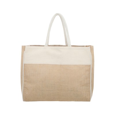 Bolsa de yute laminada con algodón, fuelle y asas. Medidas: 32 alto x 39.5 ancho