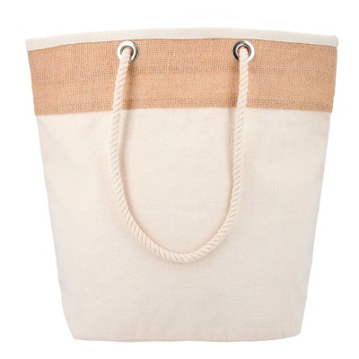 Bolsa de yute y algodón con arillos metálicos, asas y fuelle. Medidas: 35.5 alto x 39 ancho