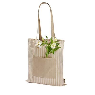 Bolsa ecológica de algodón reciclado. Sin fuelle. Incluye bolsillo frontal. Estampado de rayas. Medidas: 38 x 42 cm