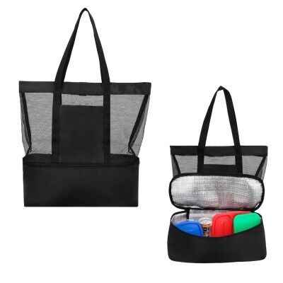 Bolsa de red con 1 compartimento principal, 1 bolsa frontal y lonchera metalizada con cierre en la parte inferior, cuenta con 2 asas superiores. Medidas: 43.5 alto x 36.7 ancho