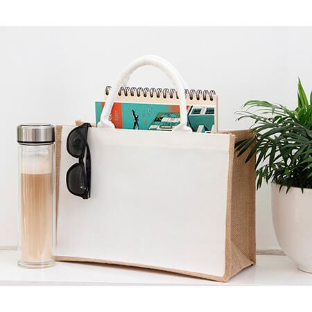 Bolsa fabricada en algodón de 120 onzas con detalles en yute en laterales y contorno. El diseño de esta bolsa cuenta con un par de asas que te permiten cargarla de manera segura y cómoda. Medidas: 26x36.5 cm.
