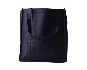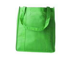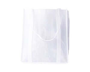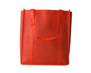 Bolsa rectangular con fondo plano en non woven, asas cosidas al cuerpo de la bolsa, fondo reforzado con base de cartón. Para todo uso.