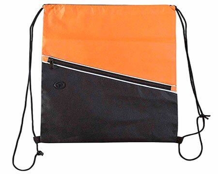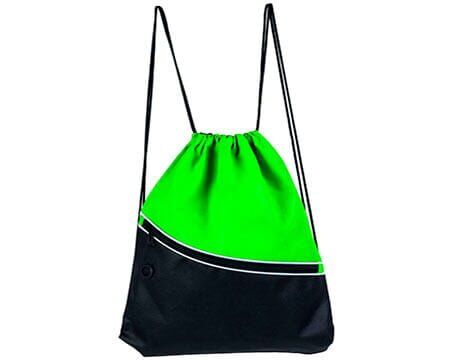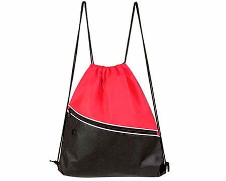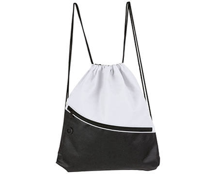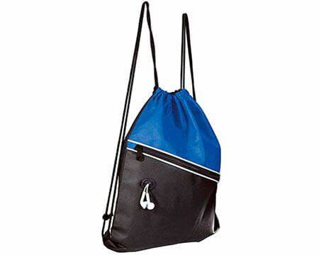 Bolsa-mochila con tirantes de cordón y cerrado de jareta. Incluye bolsa frontal con cierre y aditamento especial para audífonos. Medidas: 34 x 44.5 cm