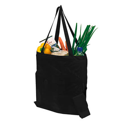 Polyester. Bolsa plegable para compras con asas largas, gancho lateral plástico para colgar y funda con cierre de velcro. 38 x 42 cm. Aprox.