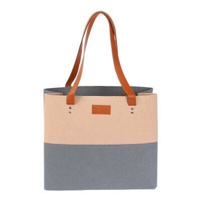Bolso de mano fabricado en poliéster, con diseño suave, y detalles de cuero sintético. Incluye dos asas para cargar. Diseño bicolor. Medidas: 31x34x8 cm.